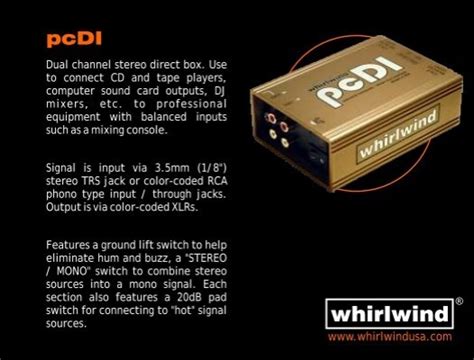 Web Product Description The Pcdi From Whirlwind Is A Dual Channel Direct Box With Rca Phono, 1/8 Trs Stereo Mini, And 1/4 Ts Connectors, Designed To Interface Unbalanced Stereo.